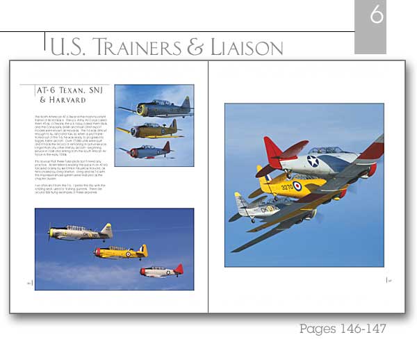 "The North American AT-6 Texan is the most important trainer of World War II. The U.S. Army Air Corps called them AT-6s, or Texans; the U.S. Navy called them SNJs, and the Canadians, British and most other export models were known as Harvards. The T-6 was difficult enough to fly, land and taxi, so when a pilot transitioned out of the T-6, he was ready to progress into bigger, faster aircraft. Over 17,000 units were built and it holds the record of remaining in active service longer than any other military aircraft beginning service in 1938 and retiring from the South African Air Force in the early 1990s. It's obvious that these Tulsa pilots don't need any practice. Alden Miller is leading the pack in an AT-6G, followed closely by Ike Enns in his yellow Harvard, as he's chased by Greg Shelton. Greg and his T-6 with the impressive smoke system were featured as the chapter divider. I've often shot from the T-6. I prefer the SNJ with the rotating seat, used for training gunners. There are around 500 flying examples of these airplanes." ![]() |